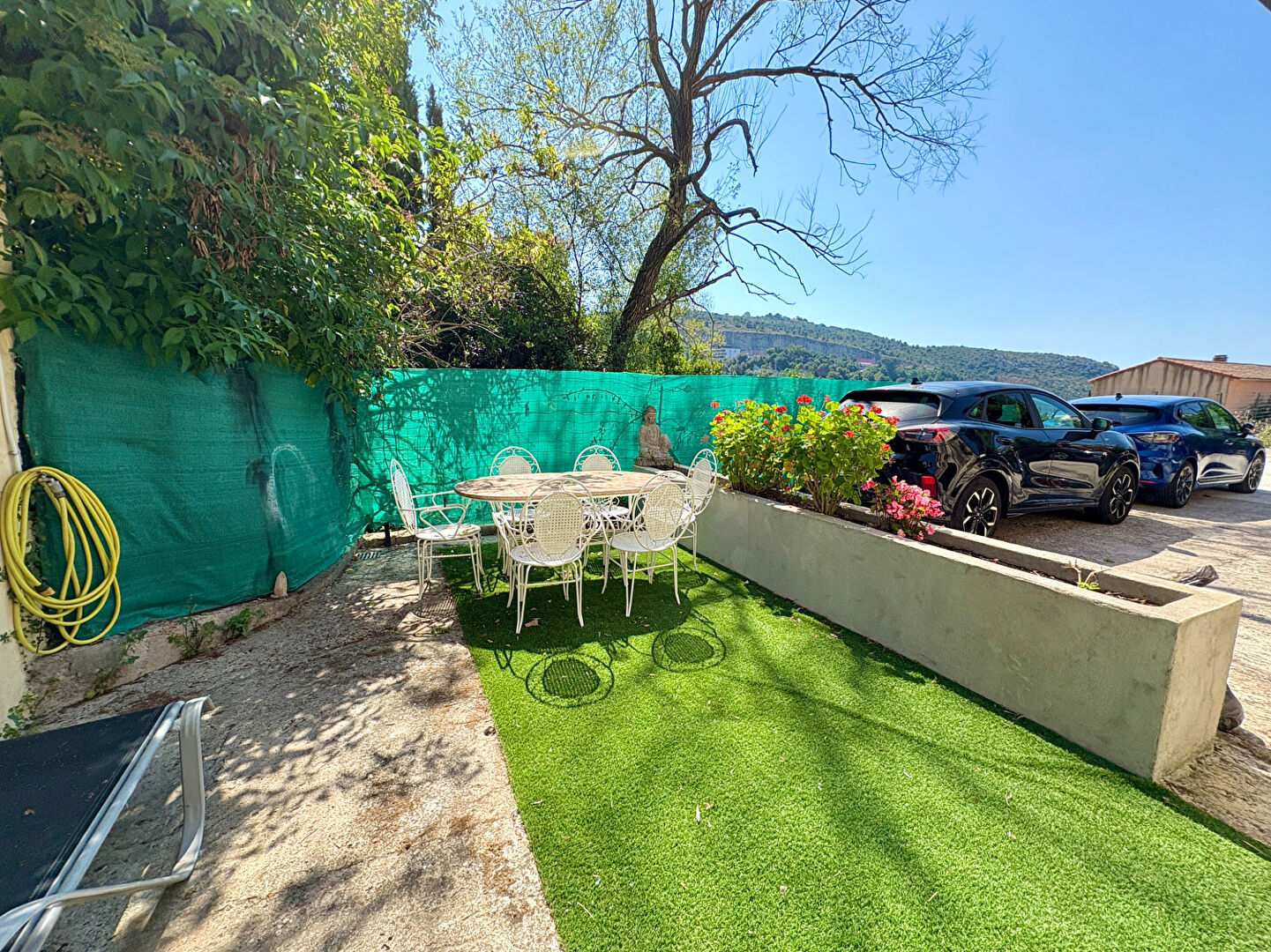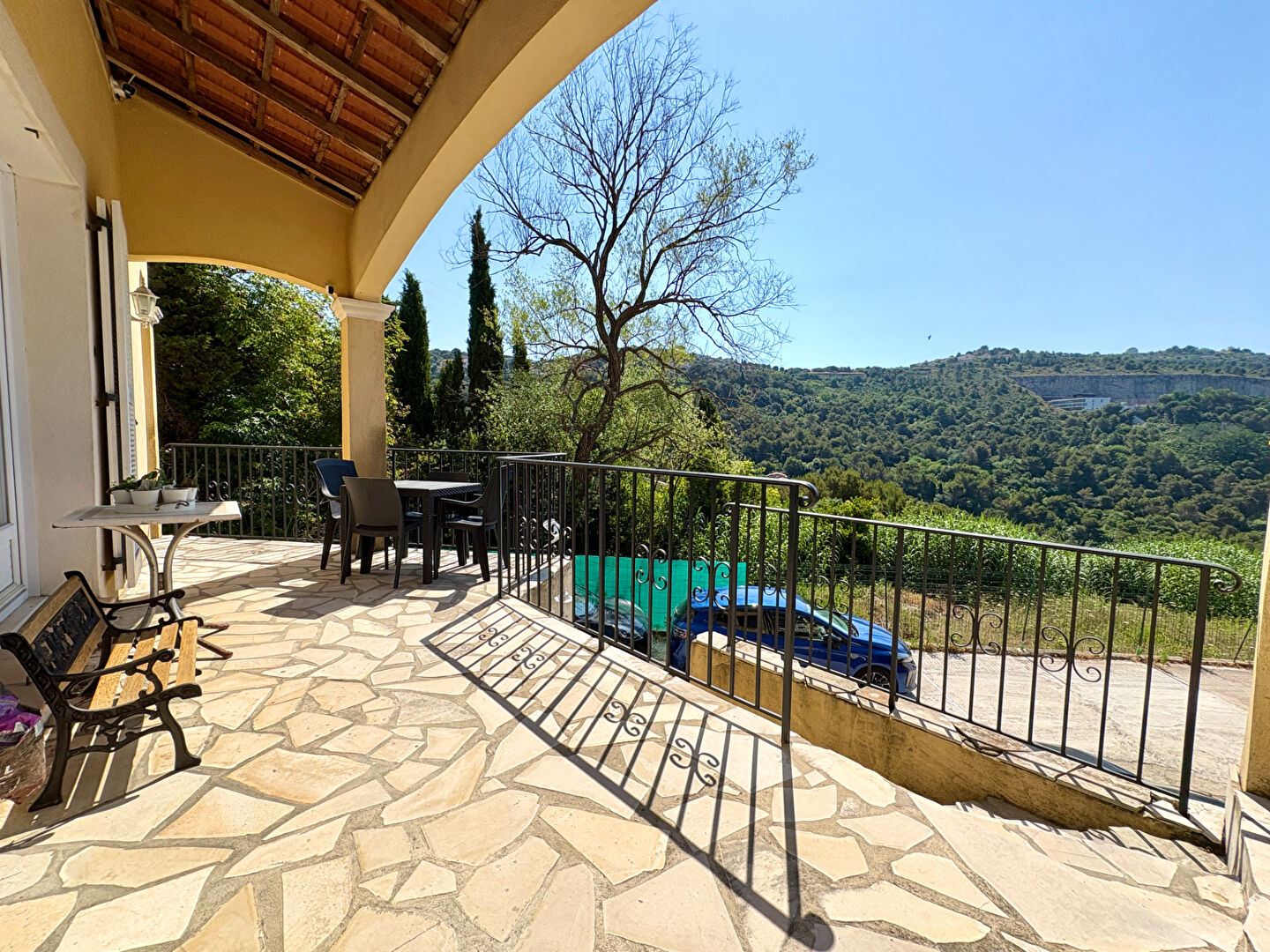 La propriété dispose également de cinq places de stationnement, plusieurs emplacements motos, ainsi que d’une grande cave offrant un espace de stockage supplémentaire.
